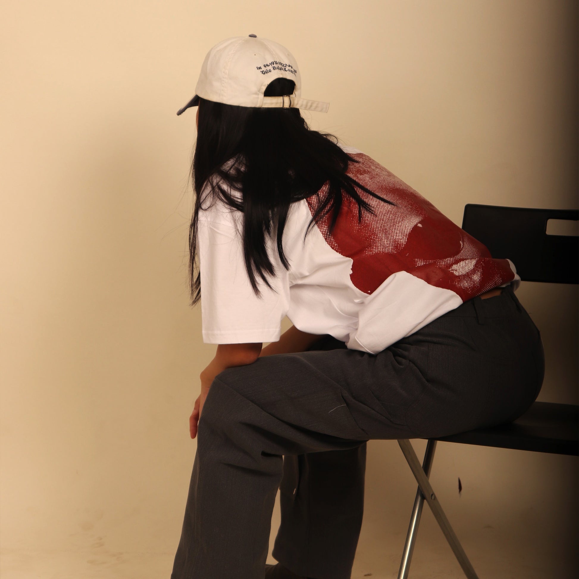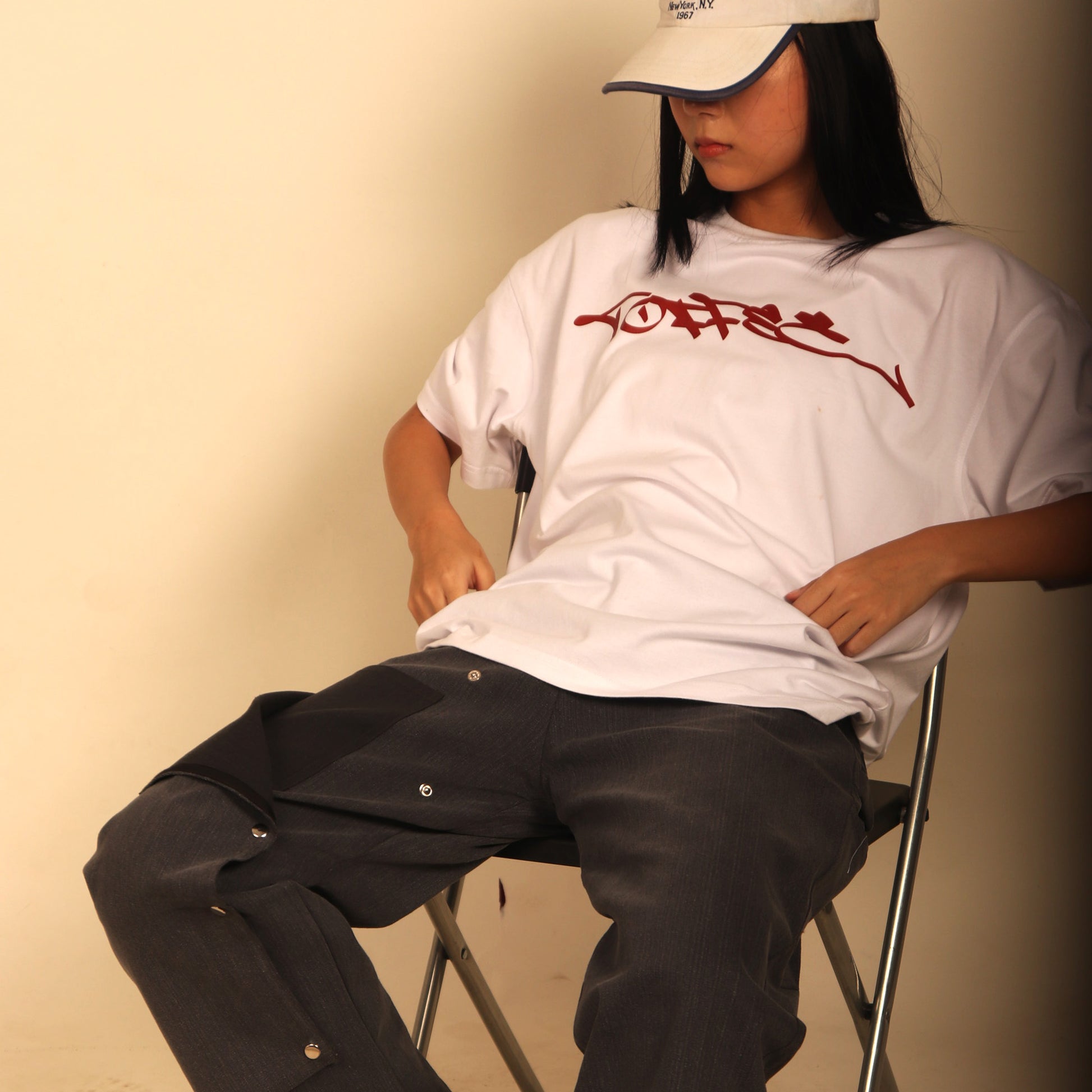 A classic red print on white with the signature design on back and toffee's branding on the chest
